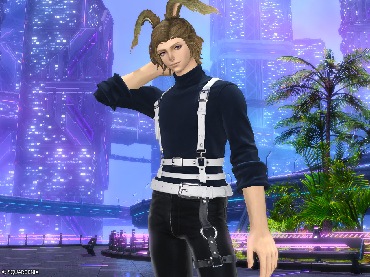 私はリアルがうだるような酷暑だと、エオルゼアでも暑苦しい格好はしたくないので、すっかり夏コーデのミラプリに切り替えているのですが、そういう意味では今回のベルトレザー・コスチュームセットは完全に季節外れですね。