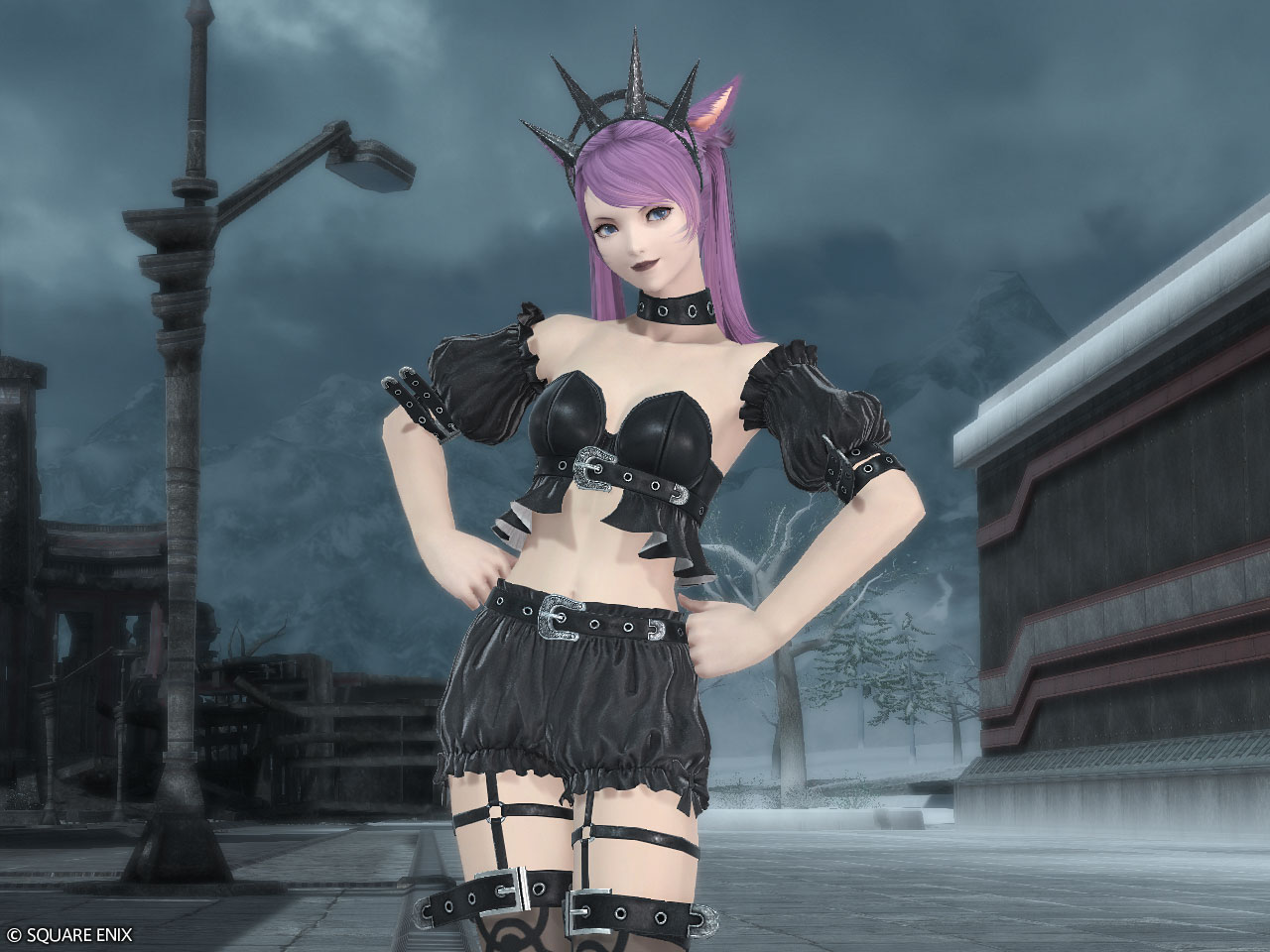 脚装備のガラテア・タイツがドロワーズっぽいデザイン且つエロいストッキングのセットなのでそのまま使いたくなるところですが、それでは芸がなさ過ぎるで、こういう痛い系ファッションでしか出番のないクウェインチュレル・ラッフルスカートを合わせました。