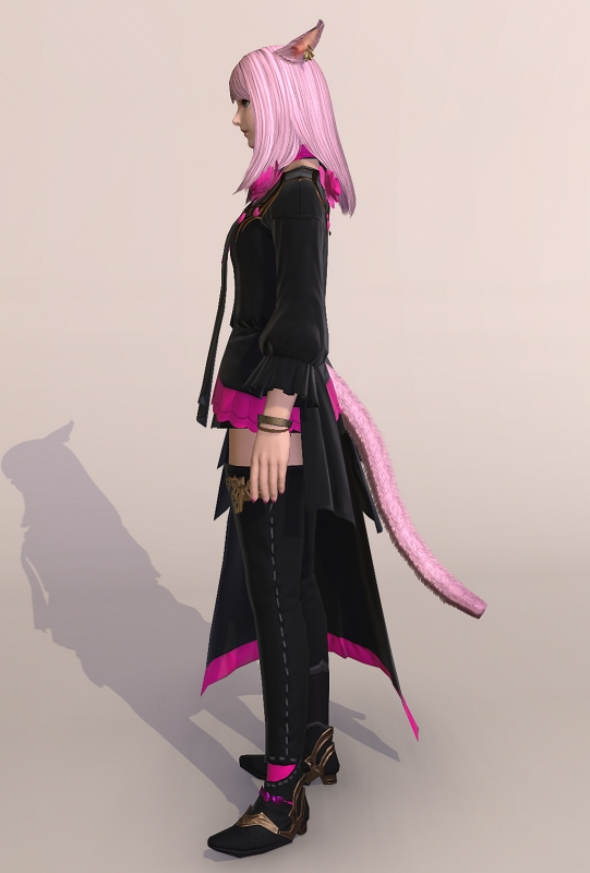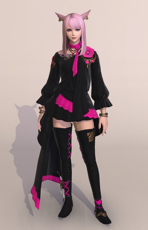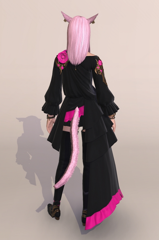 全体的なシルエットは相変わらずのアシンメトリ&謎のビラビラがくっついてるFF14胴装備のテンプレながら、バラの花弁モチーフの装飾が絶妙なバランスで配置されていて、シンプル過ぎず、且つゴテゴテし過ぎない、それでいて今までに無かったデザイン的な主張もある良い服だと思います。