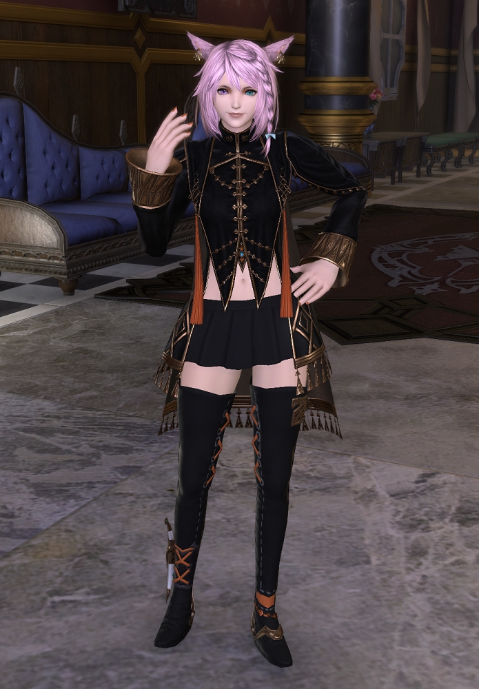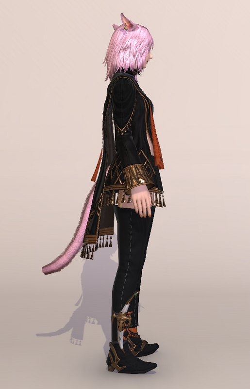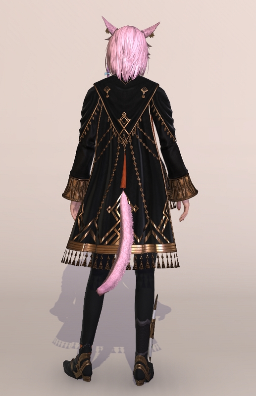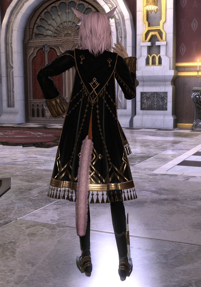 後ろ姿はいつものFF14胴装備のマント縛りなんですが、黒地に金の刺繍がちょっとハイセンスですね。